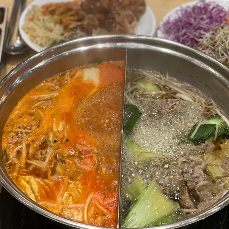 고기는 소고기와 돼지고기 두 종류가 준비되어 있었다. 윤기가 흐르는 신선한 고기를 보니 저절로 군침이 돌았다. 얇게 썰린 고기를 육수에 살짝 담갔다가 건져 먹으니, 입안에서 사르르 녹는 듯했다. 곰탕 육수의 깔끔함이 고기의 풍미를 더욱 깊게 만들어주었고, 얼큰 육수는 매콤한 맛으로 느끼함을 잡아주어 끊임없이 고기를 흡입하게 만들었다.