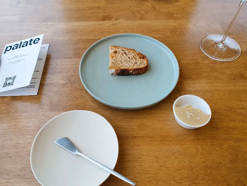 가장 먼저 따뜻하게 구워진 사워도우와 다시마 버터가 나왔다. 겉은 바삭하고 속은 촉촉한 사워도우는 그 자체로도 훌륭했지만, 다시마 버터를 발라 먹으니 풍미가 더욱 깊어졌다. 은은한 바다 향이 느껴지는 다시마 버터는, 마치 바닷가에서 갓 구운 빵을 먹는 듯한 느낌을 선사했다. 짭짤하면서도 고소한 맛이 입맛을 돋우기에 충분했다. 정갈하게 놓인 커트러리와 ‘palate’라고 적힌 메뉴판은 식사의 시작을 더욱 설레게 했다.