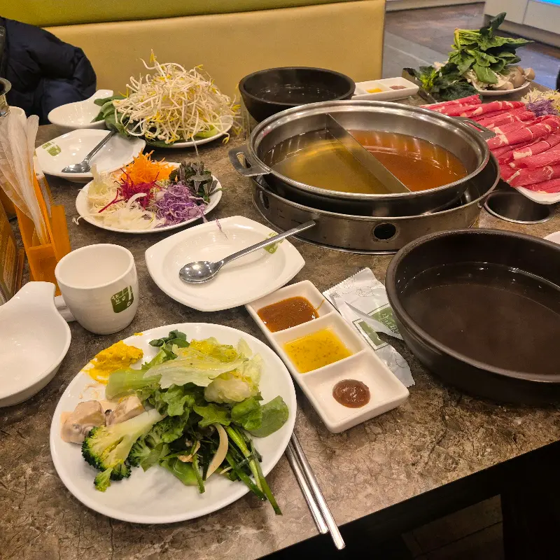 가장 먼저 육수가 준비되었다. 냄비는 두 칸으로 나뉘어져 있어 취향에 따라 육수를 선택할 수 있었다. 맑고 깔끔한 육수와 매콤한 육수, 두 가지 모두 맛보고 싶어 고민 없이 반반으로 주문했다. 육수가 끓기 시작하자 은은한 향이 코를 간지럽혔다.