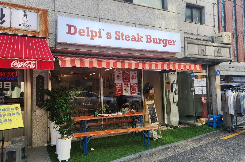망원역에서 내려 시장 골목을 지나, 낡은 주택들이 옹기종기 모여 있는 좁은 길을 따라 걷다 보니, 마치 숨겨진 보석처럼 자리 잡은 작은 가게 하나가 눈에 들어왔다. 붉은색과 흰색의 스트라이프 어닝 아래, “Delpi’s Steak Burger”라는 간판이 정겹게 빛나고 있었다. 그래, 바로 이곳이었다. 마치 미국 소도시의 작은 식당에 온 듯한 기분 좋은 착각이 들었다.
