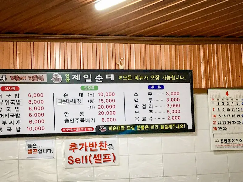 식사를 마치고 계산을 하려고 보니, 벽에 붙은 메뉴판 옆에 “추가 반찬은 Self(셀프)”라는 문구가 눈에 띄었다. 나는 깍두기를 너무 많이 먹은 탓에 조금 죄송한 마음이 들었지만, 그만큼 맛이 훌륭했다는 증거이기도 했다. 가게 안은 여전히 손님들로 북적였고, 연신 순대국밥을 주문하는 소리가 끊이지 않았다. 나는 가게를 나서며, 왜 이곳이 진안 지역명에서 그토록 유명한 맛집인지 알 수 있었다.