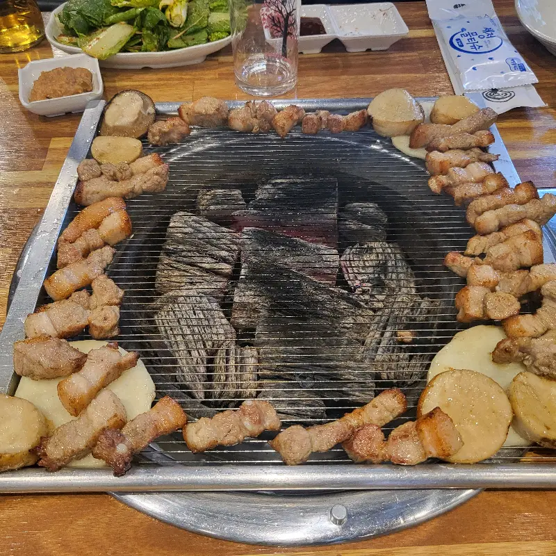 을 보면, 잘 익은 고기 옆에 가지런히 놓인 구운 감자와 멜젓이 보이네요. 이처럼 “솔방구리 삼겹살”에서는 곁들여 먹을 수 있는 다양한 요소들이 준비되어 있어, 더욱 풍성한 맛을 즐길 수 있습니다. 따뜻한 숯불에 구워 먹는 감자는 달콤했고, 멜젓은 돼지고기의 풍미를 한층 끌어올려 줬죠.