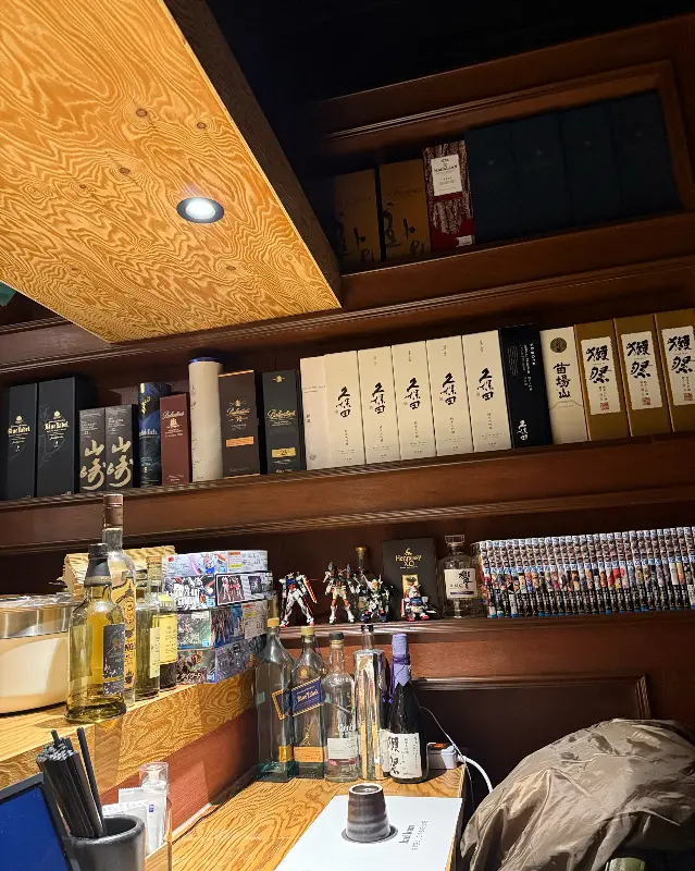 문을 열자마자 풍겨오는 맛있는 냄새는 텅 비었던 속을 요동치게 했다. 테이블은 이미 사람들로 북적였지만, 다행히 미리 예약해둔 덕분에 안쪽 구석자리에 앉을 수 있었다. 자리에 앉아 주변을 둘러보니, 아늑하면서도 세련된 인테리어가 눈에 들어왔다. 나무로 만들어진 테이블과 의자, 그리고 벽면을 가득 채운 일본 술병들이 이곳이 단순한 술집이 아닌, 특별한 공간임을 말해주고 있었다. 은은하게 흐르는 음악소리는 대화를 나누기에도, 혼자 조용히 술 한잔 기울이기에도 안성맞춤이었다.