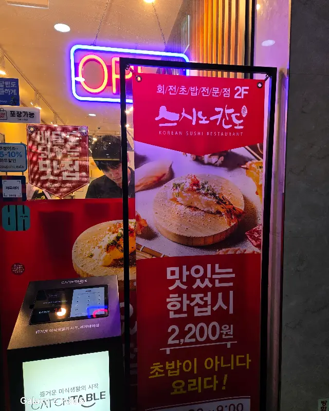왕십리역에 도착해 이마트로 향하는 길, 2층에 자리 잡은 스시노칸도의 간판이 한눈에 들어왔다. 네온사인으로 빛나는 상호와 함께, “맛있는 한접시 2,200원”이라는 문구가 발길을 붙잡았다.