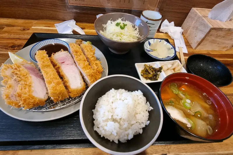 윤기가 자르르 흐르는 밥과 따뜻한 장국, 그리고 두툼한 돈까스가 가지런히 놓인 모습은 그야말로 완벽했다. 갓 튀겨져 나온 로스카츠는 황금빛 튀김옷을 자랑하며 먹음직스러운 자태를 뽐냈다. 한눈에 보기에도 신선해 보이는 돼지고기는 육즙을 가득 머금고 있었고, 얇고 바삭한 튀김옷은 완벽한 조화를 이루었다. 젓가락으로 조심스럽게 돈까스 한 점을 집어 들었다. 바삭하는 소리와 함께 느껴지는 묵직함은 최고의 맛을 예감하게 했다.