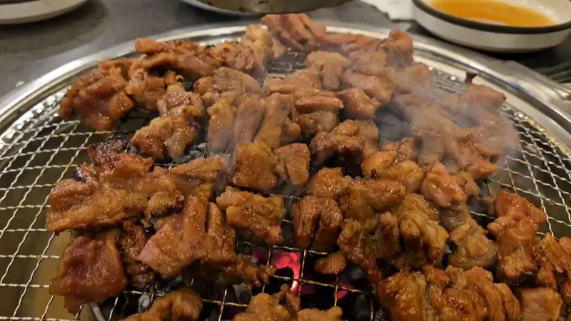 드디어 기다리고 기다리던 돼지갈비가 등장했습니다. 숯불 위에 올려진 갈비는 치익- 소리를 내며 맛있게 익어갔습니다. 달콤한 양념 냄새가 코를 찌르고, 윤기가 좌르르 흐르는 모습은 정말 참기 힘든 유혹이었습니다. 잘 익은 갈비 한 점을 집어 입에 넣으니, 부드러운 육질과 달콤 짭짤한 양념이 환상적인 조화를 이룹니다. 어릴 적 먹던 바로 그 맛, 변치 않은 맛에 감탄했습니다.