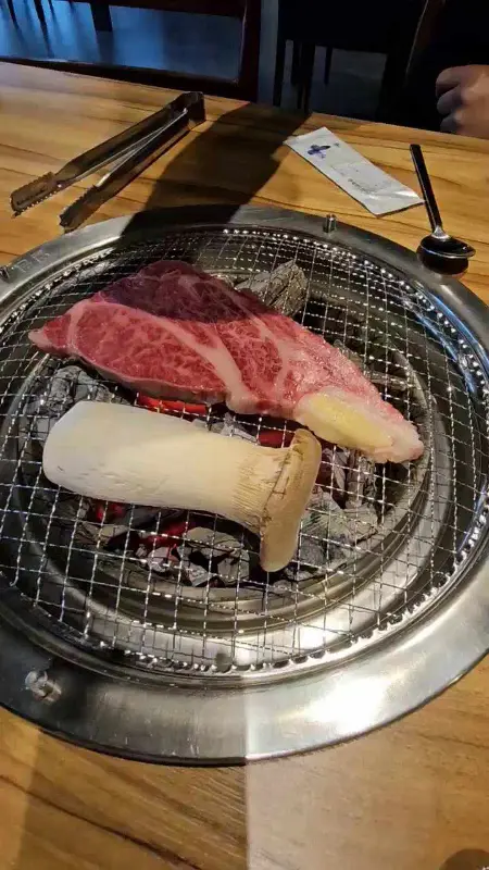 드디어 기다리고 기다리던 모듬 세트가 나왔다. 붉은 빛깔의 한우는 마블링이 예술이었다. 신선함이 눈으로도 느껴질 정도였다. 등심, 안심, 채끝 등 다양한 부위가 가지런히 담겨 있었고, 곁들여 먹을 수 있도록 새송이버섯도 함께 나왔다. 숯불 위에 고기를 올리자, 치이익 소리와 함께 맛있는 냄새가 코를 자극했다. 참을 수 없는 식욕이 솟아올랐다.