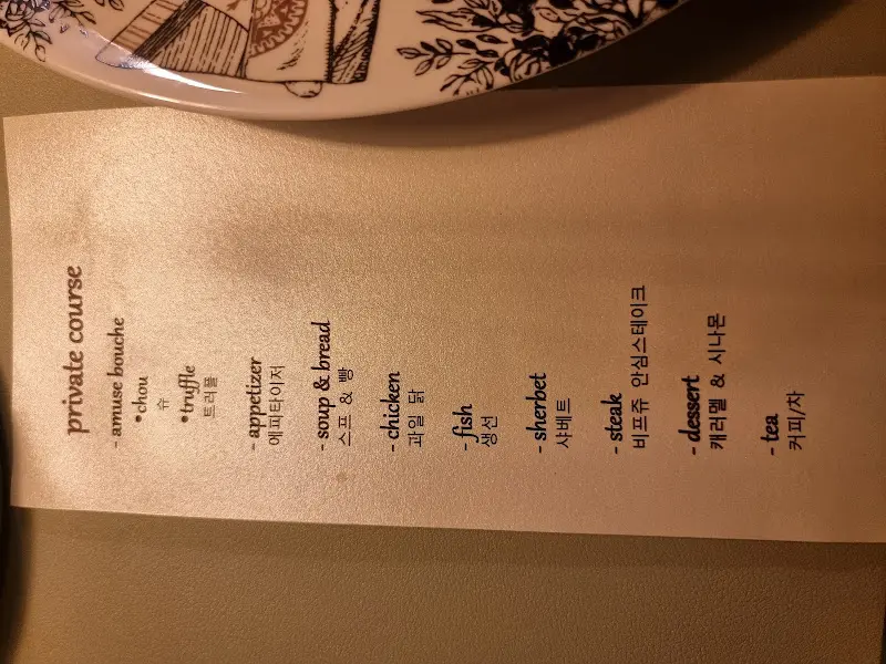 4번째 방문이라는 단골손님처럼, 나 역시 기념일마다 이곳을 찾게 될 것 같다는 예감이 들었다. 자리에 앉아 메뉴판을 펼쳐보니, 코스 요리 구성이 눈에 띄었다. 육회, 닭고기, 생선, 스테이크 등 다양한 재료를 사용한 요리들이 코스에 포함되어 있어, 눈과 입이 모두 즐거울 것 같았다. 특히, 이곳 사장님께서 직접 만드신다는 특제 소스에 대한 기대감이 컸다.