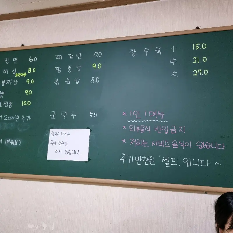 정선생옛날짜장의 메뉴판. 칠판에 분필로 적어놓은 메뉴가 정겹다.