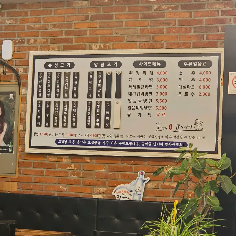 자리를 잡고 앉아 메뉴판을 스캔했다. 숙성 삼겹살, 숙성 오겹살, 가브리살, 돼지 껍데기… 끝없이 펼쳐지는 고기들의 향연에 정신을 놓을 뻔했다. 게다가 무한리필이라니, 이 어찌 아니 행복할 수 있을까! 다양한 부위의 고기를 마음껏 즐길 수 있다는 점이 가장 큰 매력으로 다가왔다. 숙성된 고기들의 풍미는 과연 어떨까? 기대감에 침샘이 폭발하기 시작했다.