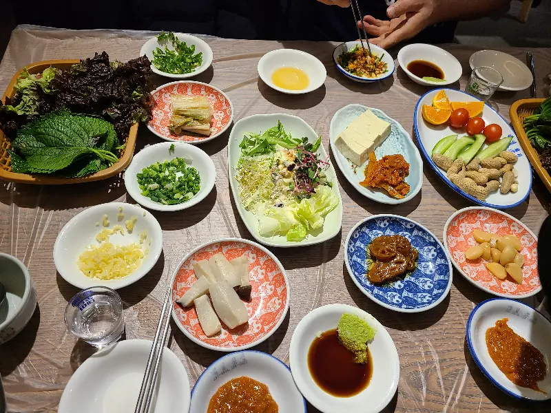 다채로운 밑반찬이 가득 차려진 테이블