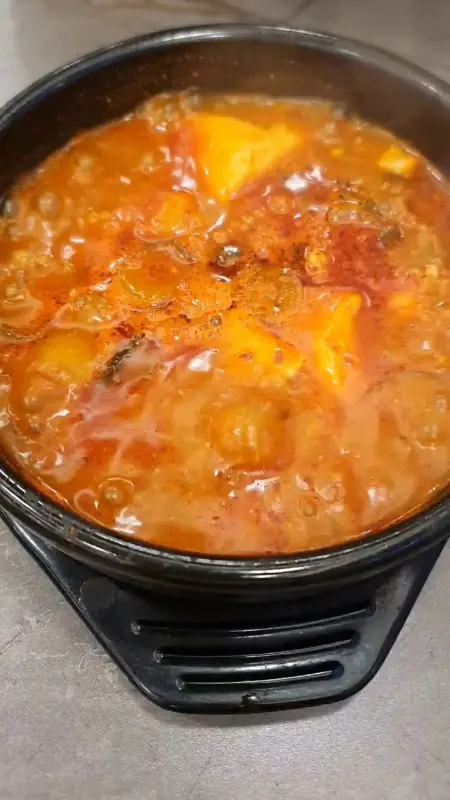 드디어 기다리고 기다리던 완뚝순두부가 나왔다. 뚝배기 안에서 보글보글 끓는 순두부찌개의 모습은 그야말로 예술이었다. 붉은 국물 위로 몽글몽글 떠오른 순두부와 고춧가루, 파의 조화는 식욕을 자극했다. 숟가락으로 국물을 한 입 떠먹으니, 깊고 진한 맛이 입안 가득 퍼졌다. 얼큰하면서도 시원한 국물은 새벽의 추위를 단숨에 녹여주었다.