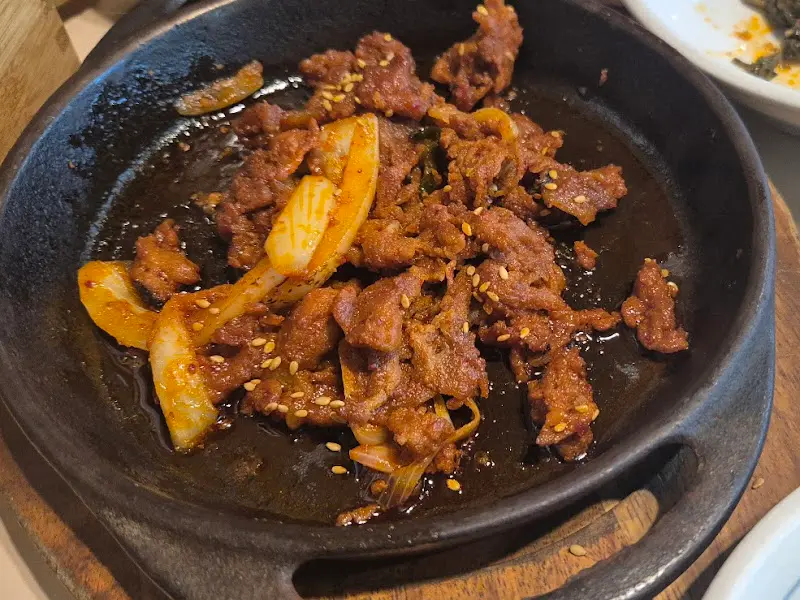 가장 먼저 눈에 들어온 것은 윤기가 좔좔 흐르는 제육볶음이었다. 먹음직스러운 붉은 빛깔과 은은하게 풍기는 불향이 식욕을 자극했다. 젓가락을 들어 한 점 맛보니, 입안 가득 퍼지는 매콤달콤한 양념과 부드러운 돼지고기의 조화가 환상적이었다. 특히 은은하게 느껴지는 불향이 제육볶음의 풍미를 한층 더 끌어올렸다. 제육볶음을 쌈 채소에 싸서 먹으니, 신선한 채소의 아삭함과 제육볶음의 풍미가 어우러져 더욱 맛깔스러웠다.