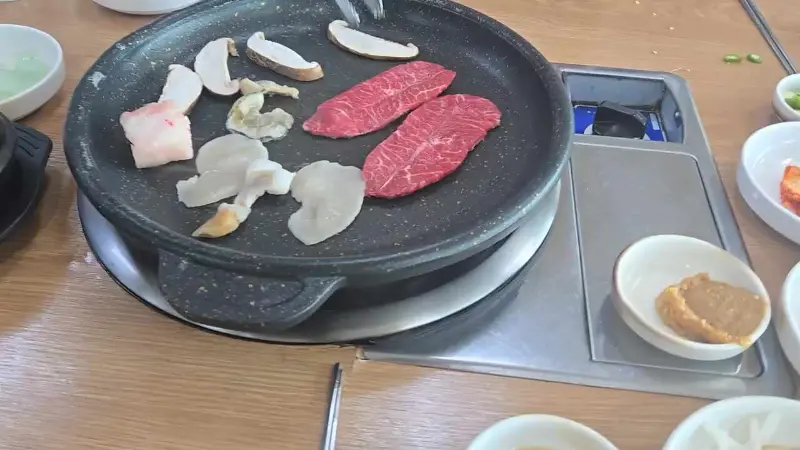 뜨겁게 달궈진 불판 위에 한우와 키조개 관자, 표고버섯을 함께 올렸다. 치이익-! 하는 소리와 함께 고소한 냄새가 코를 자극했다. 한우는 순식간에 겉면이 노릇하게 익어갔고, 키조개 관자는 촉촉함을 유지한 채 익어갔다. 표고버섯 역시 은은한 향을 풍기며 맛있게 익어갔다.