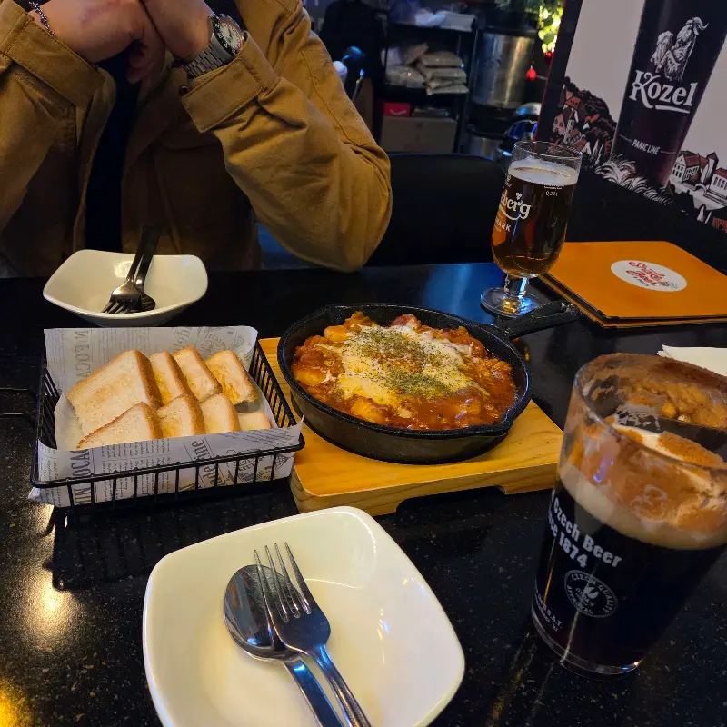 코젤 다크를 음미하며 메뉴판을 다시 살펴보니, 안주 메뉴 또한 훌륭해 보였다. 파스타, 피자, 감바스 등 다양한 메뉴들 중에서, 나는 쉐이크비어의 또 다른 인기 메뉴인 에그인헬을 주문했다. 토마토소스의 매콤함과 계란의 부드러움이 어우러진 에그인헬은, 맥주와 환상적인 궁합을 자랑했다. 특히, 매운 음식을 좋아하는 나에게는 그 맵기를 조절할 수 있다는 점이 큰 매력으로 다가왔다.