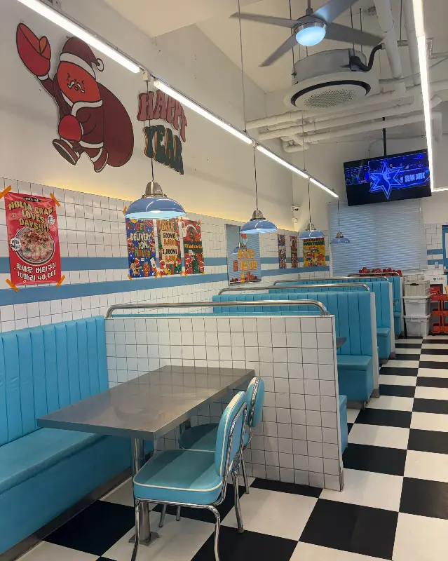드디어 도착한 놀자대게 양양시장점. 문을 열고 들어서자, 깔끔하면서도 쾌적한 인테리어가 눈에 들어왔다. 파란색과 흰색의 조화가 시원한 느낌을 주었고, 테이블 간 간격도 넉넉해서 편안하게 식사를 즐길 수 있을 것 같았다. 천장에는 실링팬이 유유히 돌아가고 있었다. 밝은 조명이 테이블 위를 비추고, 활기찬 분위기가 감돌았다.