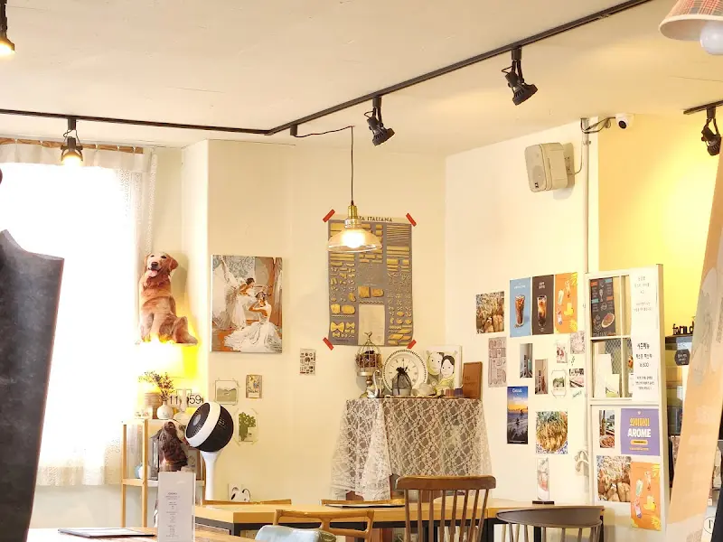주문을 마치고 가게 안을 둘러보았다. 천장에는 레일 조명이 설치되어 있어 은은한 분위기를 더했고, 벽에는 그림과 사진들이 걸려 있었다. 한쪽 벽면에는 책들이 꽂혀 있는 책장이 있었는데, 마치 작은 갤러리 카페에 온 듯한 느낌이었다. 벽에 걸린 그림 중에는 콜로세움 그림도 눈에 띄었다. 천장에 달린 하얀색 벽걸이 선풍기는 앤틱한 분위기를 자아냈다.