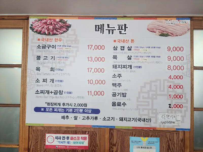 식당에 도착하니 과연 소문대로 점심시간을 훌쩍 넘긴 시간임에도 불구하고 손님들로 북적였다. 다행히 앞뒤로 넉넉하게 마련된 주차 공간 덕분에 어렵지 않게 주차를 할 수 있었다. 활기 넘치는 분위기 속에서 나는 망설임 없이 돼지찌개를 주문했다. 메뉴판을 곁눈질하니 소찌개도 인기 메뉴인 듯했고, 삼겹살을 구워 먹는 테이블도 여럿 보였다. 다음에는 꼭 삼겹살에 도전해봐야겠다고 다짐했다.