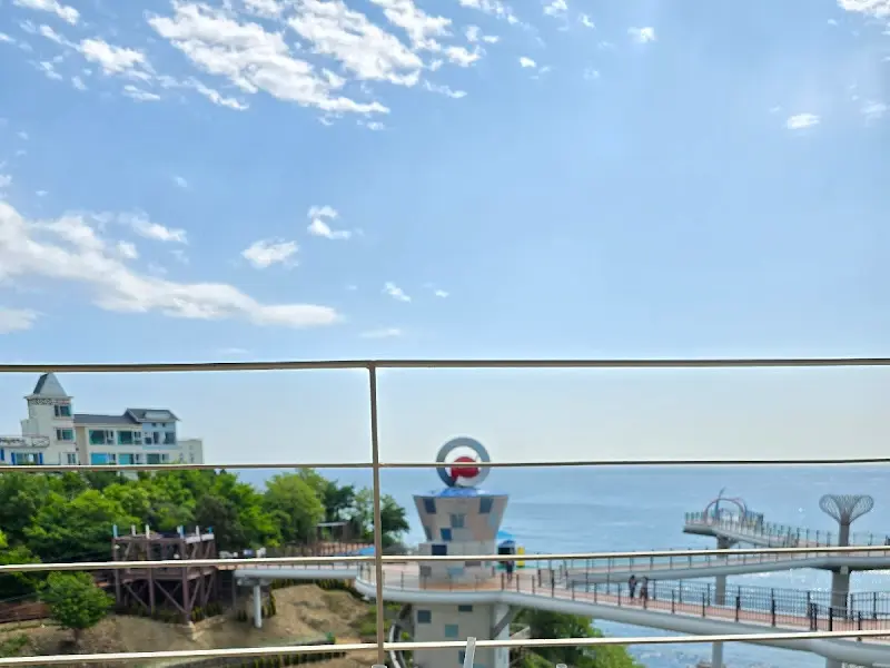 자리에 앉아 숨을 고르니, 눈 앞에 펼쳐진 풍경은 그야말로 장관이었다. 도째비골 스카이밸리와 묵호등대가 한눈에 들어왔고, 푸른 바다는 햇빛에 반짝이며 눈부시게 빛나고 있었다. 마치 그림엽서 속 한 장면처럼 아름다운 풍경에, 나는 잠시 말을 잃고 멍하니 바라보았다. 이 순간을 위해 그 힘든 언덕길을 올라왔다는 생각이 들었다.