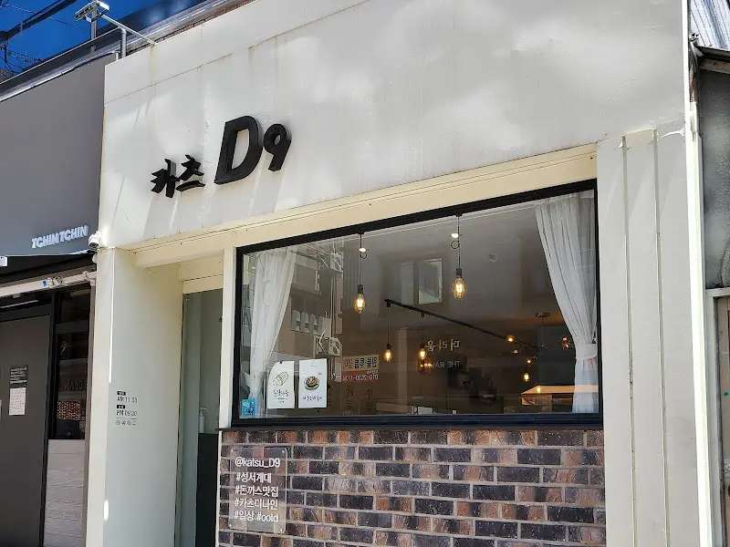 따스한 햇살이 내리쬐는 오후, 드디어 카츠 D9 앞에 도착했다. 외관부터 깔끔함이 느껴지는 곳이었다. 흰색 벽면에 검은색 폰트로 쓰여진 “카츠 D9″이라는 간판이 눈에 띄었고, 통유리 너머로 보이는 아늑한 공간이 기대감을 높였다. 벽돌로 마감된 외부 벽면과 은은하게 빛나는 조명이 어우러져 따뜻한 분위기를 자아냈다. 왠지 모르게 편안함이 느껴지는 외관 덕분에, 망설임 없이 문을 열고 안으로 들어섰다.