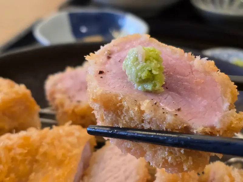 갓 튀겨낸 돈까스 위에 와사비를 살짝 올려 먹으면, 알싸한 풍미가 입안 가득 퍼진다.