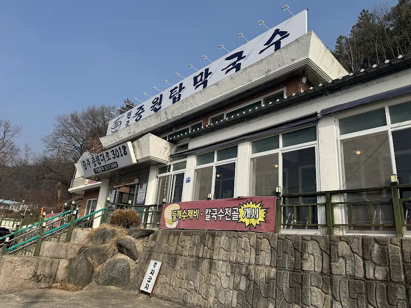 대로변에 위치한 식당은 한눈에 들어왔다. “충주 중앙대로 3018″이라는 커다란 간판이 시선을 사로잡았고, 그 아래 ‘원조중앙탑막국수’라는 글자가 오랜 역사를 짐작하게 했다. 식당 앞 넓은 주차장은 이미 차들로 가득했지만, 다행히 빈자리를 찾아 주차할 수 있었다. 진출입로가 대로변이라 조심해야 한다는 후기를 보았던 터라, 주변을 살피며 신중하게 움직였다. 식당 입구로 향하는 계단 옆에는 ‘들깨수제비, 칼국수 전문’이라고 적힌 배너가 세워져 있었다. 막국수 전문점인 줄 알았는데, 다른 메뉴도 꽤나 인기 있는 듯했다.