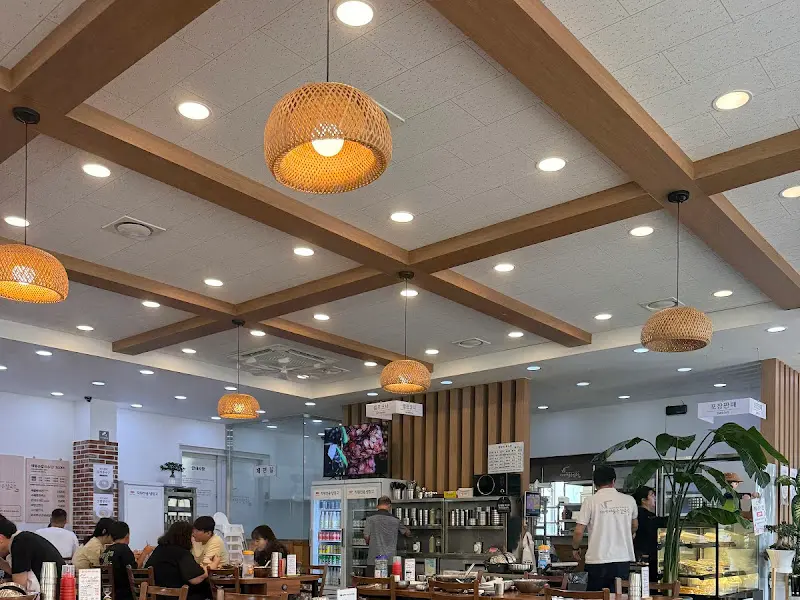 넓고 쾌적한 식당 내부. 라탄 조명이 따뜻한 분위기를 더한다.