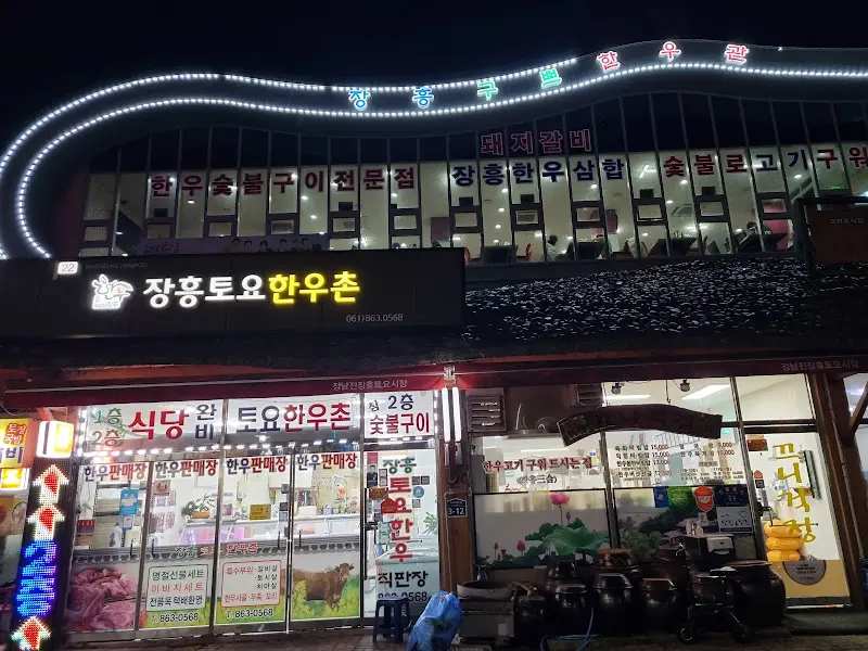 장흥 토요시장에 도착하자 활기 넘치는 분위기가 저를 맞이했습니다. 사람들로 북적이는 시장 골목을 지나, 오늘 저의 끄니, 아니 끼니를 책임져 줄 “끄니걱정”이라는 식당을 발견했습니다. ‘끄니’라는 정겨운 사투리 상호에서부터 왠지 모를 푸근함이 느껴졌습니다. 늦은 저녁 시간이었음에도 식당 안은 손님들로 가득했고, 맛있는 냄새가 코를 찔렀습니다. 역시, 맛집은 맛집인가 봅니다. 식당 건물은 2층으로 되어 있었고, 밤에도 환하게 빛나는 조명 덕분에 멀리서도 쉽게 찾을 수 있었습니다. “장흥토요한우촌”이라는 간판도 눈에 띄는군요.