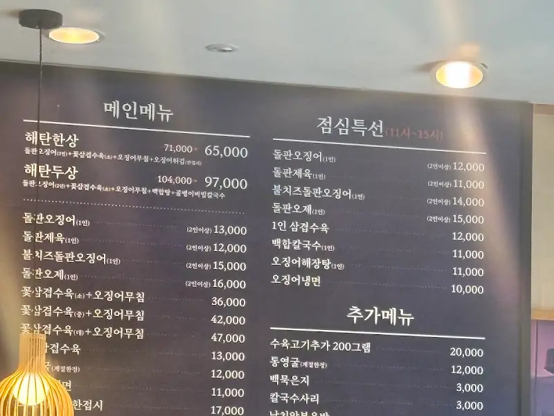 가게 문을 열고 들어서자, 맛있는 냄새가 코를 찔렀다. 테이블은 이미 손님들로 가득 차 있었지만, 다행히 한 자리가 남아있어 곧바로 자리를 잡을 수 있었다. 메뉴판을 펼쳐 들고 고민할 필요도 없이, 오늘의 목표였던 돌판오제(오징어 제육) 2인분을 주문했다. 벽에 걸린 메뉴판을 보니 점심특선 메뉴들이 눈에 띄었다. 다음에는 다른 메뉴도 한번 도전해봐야겠다는 생각이 들었다.
