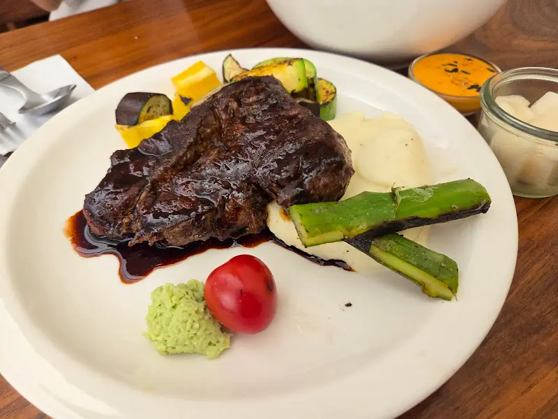 가장 먼저 나온 메뉴는 부채살 스테이크였다. 윤기가 자르르 흐르는 스테이크와 알록달록한 가니쉬가 눈을 즐겁게 했다. 스테이크를 한 입 크기로 썰어 입에 넣는 순간, 감탄사가 절로 나왔다. 겉은 바삭하게 구워져 있었지만, 속은 촉촉하고 부드러웠다. 입안 가득 퍼지는 육즙은 정말 최고였다. 특히, 스테이크 소스가 정말 훌륭했다. 스테이크의 풍미를 한층 더 끌어올려 주는 느낌. 매쉬 포테이토와 신선한 야채 가니쉬 또한 스테이크와 완벽한 조화를 이루었다. 어르신들도 정말 좋아할 맛이라는 생각이 들었다.