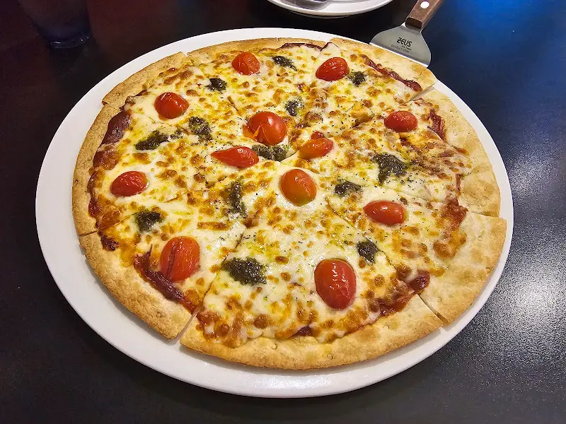 마르게리타 피자: 토마토소스의 상큼함과 치즈의 고소함, 그리고 바질의 향긋함이 완벽하게 어우러진 피자. 도우는 얇고 바삭해서 식감을 더욱 살려준다.