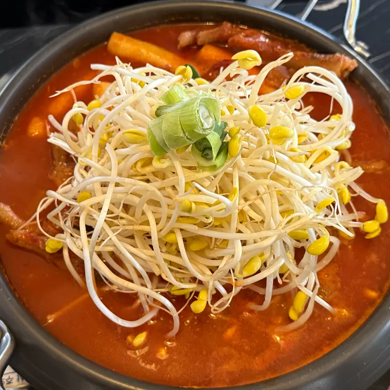 매콤한 양념에 콩나물이 듬뿍 올라간 국물 닭발