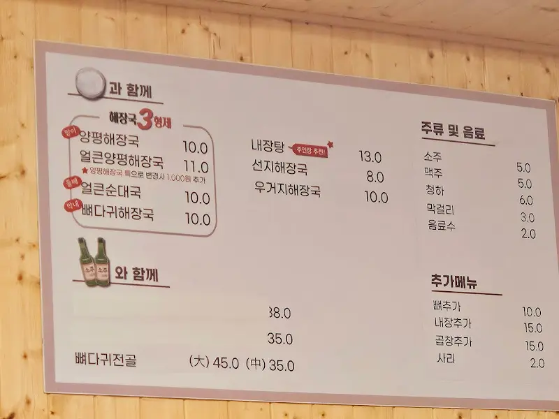 가게 문을 열고 들어서자, 새벽 시간임에도 불구하고 이미 많은 사람들이 뜨끈한 국물을 앞에 두고 있었다. 나무로 마감된 벽면은 소박하면서도 정겨운 느낌을 주었고, 테이블 위에는 김이 모락모락 피어오르는 해장국 뚝배기가 놓여 있었다. 메뉴판을 힐끗 훑어보니, 양평해장국을 비롯해 내장탕, 선지해장국, 뼈다귀해장국 등 다양한 종류의 해장국이 준비되어 있었다. 순간 내장탕에 살짝 마음이 흔들렸지만, 아쉽게도 오늘은 내장탕이 준비되지 않았다는 이야기에, 결국 가장 기본인 양평해장국을 주문했다. 다음에는 꼭 내장탕을 먹어보리라 다짐하며.