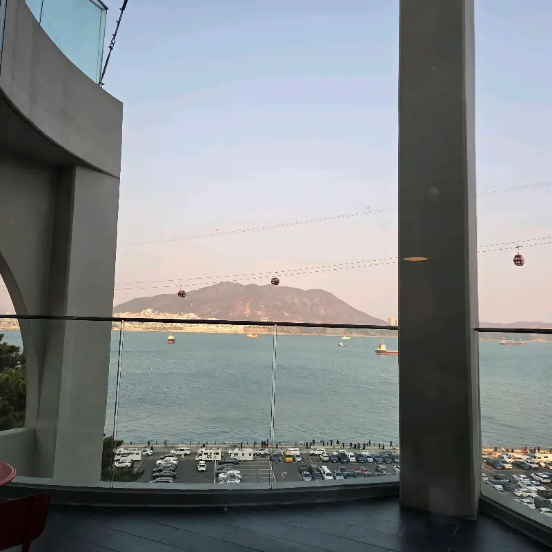 자리를 잡기 위해 카페를 둘러보았다. 창가 자리는 이미 사람들로 가득했지만, 다행히 케이블카가 한눈에 들어오는 명당자리를 발견할 수 있었다. 자리에 앉아 창밖을 바라보니, 송도해상케이블카가 바다 위를 유유히 가로지르고 있었다. 마치 하늘을 나는 듯한 케이블카의 모습은 낭만적인 분위기를 더했다.