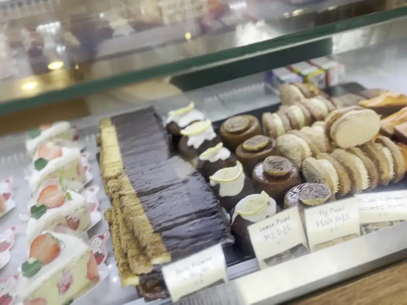 진열대 안에는 먹음직스러운 빵들이 가득했다. 윤기가 흐르는 크루아상부터, 앙증맞은 까눌레, 고소한 인절미 슈까지. 하나하나 정성스럽게 만들어진 빵들을 보니, 저절로 미소가 지어졌다. 특히 겹겹이 쌓인 크루아상의 결은 보기만 해도 바삭함이 느껴지는 듯했다. 쇼케이스 안에는 딸기 조각 케이크와 마카롱 등 달콤한 디저트들이 예쁘게 진열되어 있었다. 마치 보석 상자를 보는 듯한 황홀함에 휩싸였다.