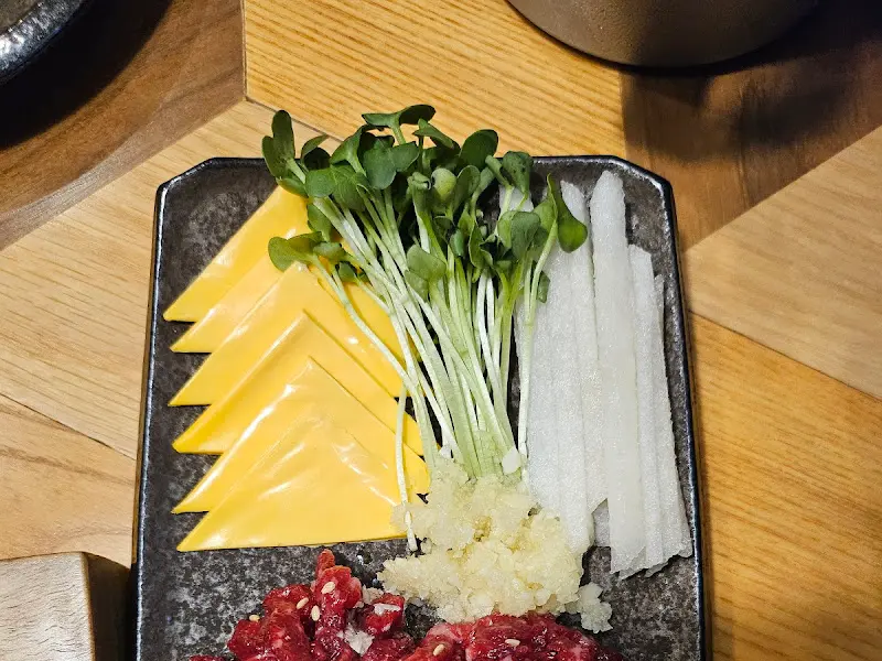 고민 끝에, 안창살과 토시살을 먼저 주문했다. 잠시 후, 정갈하게 담긴 밑반찬들이 테이블을 채웠다. 쌈 채소, 샐러드, 김치 등 하나하나 정성이 느껴지는 맛깔스러운 반찬들이었다. 특히, 맛보기로 제공되는 육회가 인상적이었다. 신선한 육회 위에 노른자를 톡 터뜨려 배와 함께 먹으니, 입안에서 살살 녹는 듯했다. 쌉싸름한 새싹 채소와 달콤한 배, 그리고 꼬득꼬득한 육회의 조화는 정말 환상적이었다. 얇게 슬라이스된 치즈와 길게 채 썰린 무는 육회와 함께 곁들여 먹으니, 느끼함은 잡아주고 풍미는 더욱 깊어졌다.