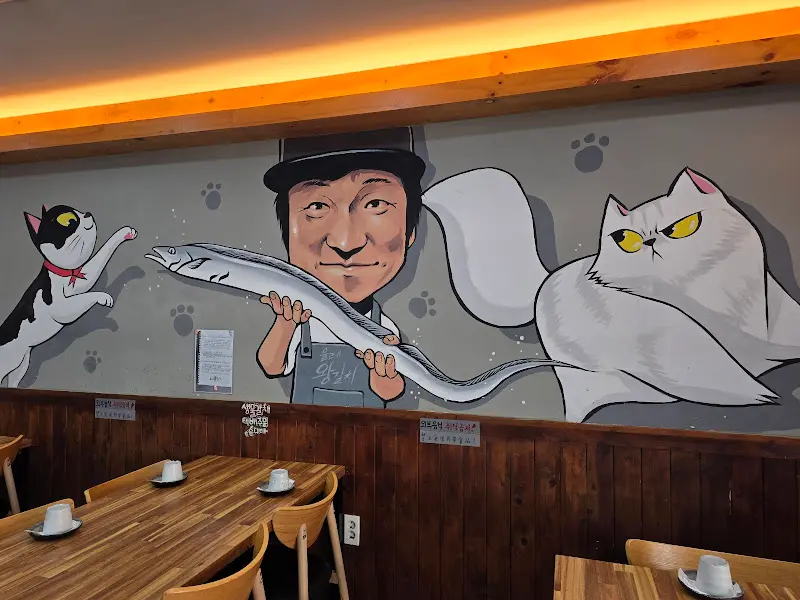 식당 문을 열고 들어서니, 정겨운 분위기가 물씬 풍겼다. 나무 테이블과 의자는 세월의 흔적을 고스란히 담고 있었고, 벽 한쪽에는 익살스러운 그림들이 그려져 있어 보는 재미를 더했다. 특히 눈길을 사로잡은 건, 갈치를 들고 있는 넉살 좋은 표정의 남자 그림과 그 옆을 지키는 듯한 두 마리의 고양이 그림이었다. 왠지 모르게 푸근하고 편안한 느낌이 들어, 마치 어릴 적 할머니 댁에 놀러 온 듯한 기분이 들었다.