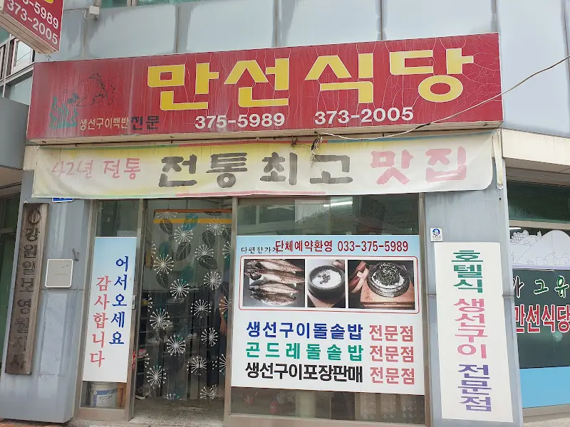 식당 앞에 도착하니, 붉은색 간판에 쓰인 ‘만선식당’이라는 글자가 정겹게 눈에 들어왔다. 간판 옆에는 세월의 흔적이 느껴지는 전화번호가 나란히 적혀 있었고, 그 아래에는 ‘생선구이, 곤드레돌솥밥 전문’이라는 문구가 기대감을 한껏 끌어올렸다. 가게 앞 길 건너편에는 주차 공간이 마련되어 있어 편리하게 차를 세울 수 있었다. 마치 어릴 적 살던 동네 어귀에 들어선 듯한 푸근함이 느껴졌다.