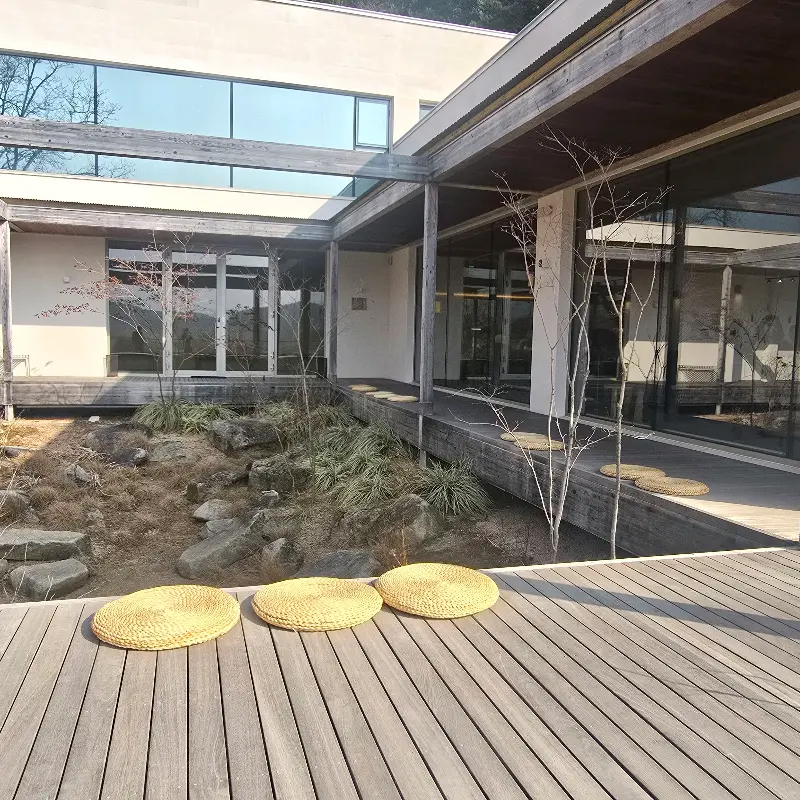 탁 트인 중정이 눈 앞에 펼쳐졌는데, 그 모습이 정말이지 장관이었다. 마치 일본 료칸에 온 듯한 고즈넉한 분위기가 마음을 편안하게 감싸주었다. 도심의 소음은 완전히 차단된 채, 은은한 햇살과 싱그러운 초록빛 식물들이 조화롭게 어우러져 있었다. 2월의 쌀쌀한 날씨에도 불구하고, 푸릇푸릇한 봄기운이 느껴지는 듯했다. 마치 다른 세계에 들어온 듯한 느낌에 잠시 넋을 잃고 풍경을 감상했다.