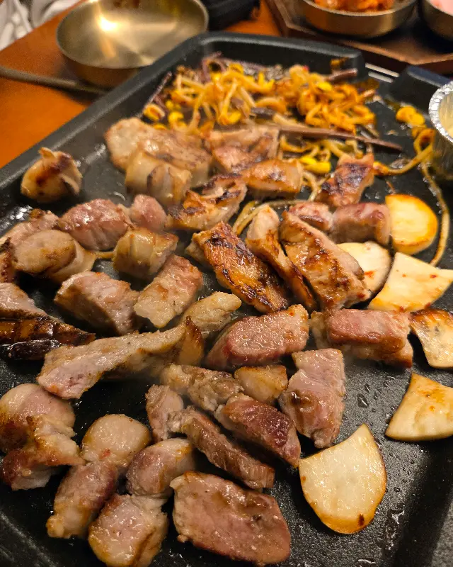 드디어 기다리고 기다리던 메인 메뉴, 담소 돈판이 등장했다. 숯불에 초벌되어 나온 고기의 비주얼은 정말이지 압도적이었다. 칼집이 섬세하게 들어가 있는 삼겹살과 목살, 그리고 뽀얀 자태를 뽐내는 항정살까지, 보기만 해도 군침이 절로 돌았다. 뜨겁게 달궈진 불판 위에 고기를 올리니, 지글거리는 소리와 함께 맛있는 냄새가 코를 자극했다. 초벌되어 나온 덕분에 연기도 많이 나지 않아, 편안하게 담소를 나누며 고기가 익기를 기다릴 수 있었다.