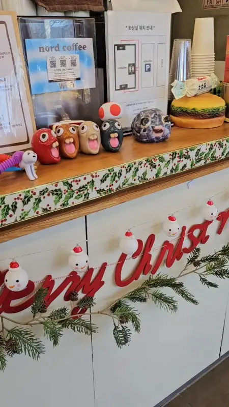 문을 열고 들어서자, 따뜻한 햇살이 가득 들어오는 밝은 공간이 눈에 들어왔다. 은은하게 퍼지는 커피 향과 함께, 아기자기한 소품들이 놓여 있는 모습이 마치 친구 집에 놀러 온 듯한 편안함을 선사했다. 한쪽 벽면에는 미국 국기가 걸려있고, 그 주변으로 다양한 그림과 사진들이 자유롭게 배치되어 있어 키치하면서도 개성 넘치는 분위기를 자아냈다. 카운터에는 크리스마스 장식이 아직 남아있어, 왠지 모르게 따뜻한 느낌을 더했다.