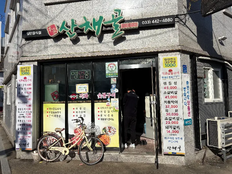 드디어 산채골 앞에 도착했다. 간판에는 ‘원산지표시 모범음식점’이라는 문구가 눈에 띄었다. 식당 입구에는 자전거 한 대가 세워져 있었는데, 낡은 듯하면서도 정겨운 모습이 마치 시골집에 놀러 온 듯한 푸근한 느낌을 주었다.