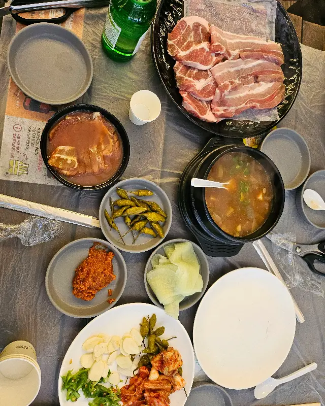 자리를 잡고 앉아 메뉴판을 살펴보니 다양한 세트 메뉴가 준비되어 있었다. 우리는 커플 세트를 주문했다. 숯불이 피워지고, 곧이어 푸짐한 한 상이 차려졌다. 삼겹살, 목살, 소세지, 새우, 버섯 등 다채로운 구성이었다. 곁들여 먹을 수 있는 김치, 마늘, 쌈 채소 등도 풍성하게 제공되었다. 특히 신선해 보이는 야채들이 마음에 쏙 들었다.