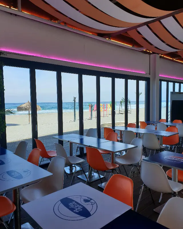 문을 열고 안으로 들어서자, 넓고 쾌적한 공간이 눈에 들어왔다. 테이블은 흰색과 주황색 의자가 번갈아 놓여 있어 생동감을 더했고, 천장에는 독특한 디자인의 조명이 은은하게 빛나고 있었다. 특히, 통유리창을 통해 들어오는 햇살이 바다를 더욱 푸르게 만들어, 마치 한 폭의 그림을 감상하는 듯했다. 핑크빛 네온 조명이 포인트를 더해, 세련되면서도 편안한 분위기를 자아냈다.