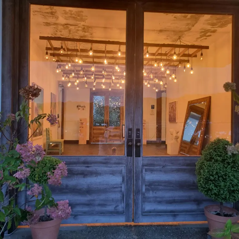 일상화카페는 예전에 학교였던 곳을 개조하여 만든 곳이라, 복도와 교실의 구조가 그대로 남아있다. 높은 천장과 넓은 공간은 시원한 개방감을 선사하며, 낡은 나무 바닥과 벽은 세월의 흔적을 고스란히 담고 있다. 곳곳에 놓인 미술 작품들은 갤러리 같은 분위기를 연출하며, 창밖으로 보이는 자연 풍경은 마음을 평화롭게 만들어준다.