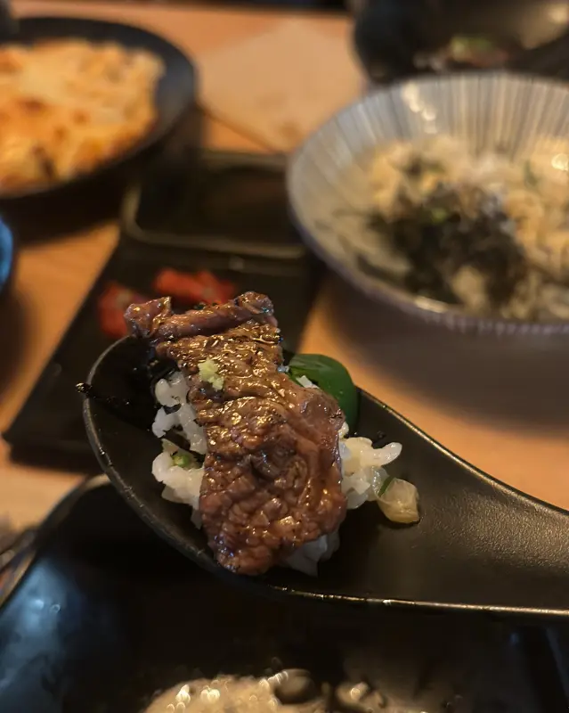 이번에는 살치살을 구워 먹어봤다. 부채살보다 조금 더 기름진 살치살은 더욱 고소하고 풍미가 깊었다. 톡톡 터지는 육즙은 마치 입안 가득 행복을 채워주는 듯했다. 함께 나온 와사비를 살짝 올려 먹으니, 느끼함은 싹 가시고 깔끔한 맛이 더욱 살아났다.