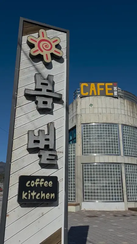 카페는 춘양면, 36번 국도변에 자리 잡고 있었다. 멀리서부터 눈에 띄는 독특한 외관이 시선을 사로잡았다. 회색빛 콘크리트 건물에 커다란 통창이 인상적이었는데, 마치 갤러리 같은 분위기를 풍겼다. 건물 옆에는 카페 이름이 쓰인 세로 간판이 서 있었다. 낡은 나무판자에 투박하게 새겨진 ‘봄볕’이라는 글자가 정겹게 느껴졌다. 간판 위에는 태양을 형상화한 듯한 조형물이 달려 있었는데, 따뜻한 햇살이 카페 전체를 감싸는 듯한 느낌을 주었다. 푸른 하늘을 배경으로 서 있는 카페의 모습은 그 자체로 한 폭의 그림 같았다.