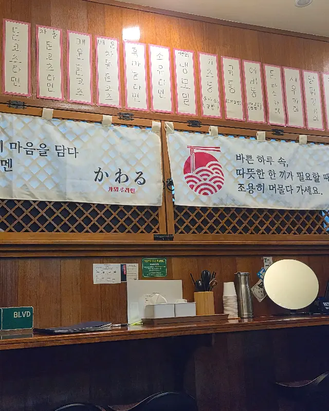 가게 문을 열자, 아늑한 분위기가 온몸을 감쌌다. 나무로 된 따뜻한 색감의 인테리어와 은은한 조명이 편안함을 더했다. 마침 한 자리가 남아있어 운 좋게 기다림 없이 바로 앉을 수 있었다. 벽 한쪽에는 메뉴가 적힌 일본어 붓글씨가 정갈하게 걸려있고, “마음을 담다, 카와루”라는 문구가 눈에 들어왔다. 비록 일본어를 완벽하게 이해하지는 못하지만, 그 정성스러운 분위기만으로도 충분히 마음이 따뜻해지는 듯했다. 혼자 온 손님들을 위한 바 테이블도 마련되어 있어, 혼밥을 즐기기에도 부담 없는 공간이었다.