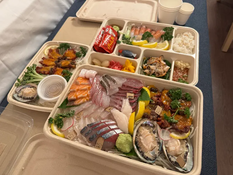 숙소 문을 열자마자 식탁 위에 포장 상자를 올려놓았다. 꼼꼼하게 포장된 상자를 열어보니, 감탄사가 절로 나왔다. 가지런하게 놓인 회들은 윤기가 좌르르 흘렀고, 신선함이 눈으로도 느껴졌다.