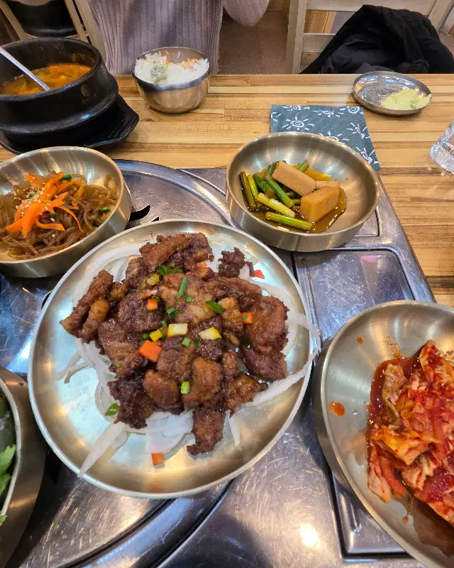 밑반찬 하나하나 정성이 느껴졌다. 특히, 양념게장은 달콤하면서도 매콤한 맛이 일품이었다. 신선한 게살은 입안에서 살살 녹았고, 젓가락을 멈출 수 없게 만드는 마성의 맛이었다. 리필을 요청했는데, 친절하게 응대해 주셔서 감사했다. 샐러드는 신선한 채소와 상큼한 드레싱의 조화가 훌륭했고, 잡채는 쫄깃한 면발과 고소한 참기름 향이 어우러져 입맛을 돋우었다.